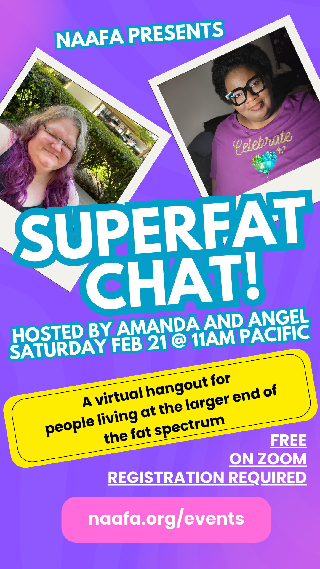 Affinity spaces are intended to be only for people of shared identity. If you are a smaller fat person, or a thin person hoping to learn more and use your privilege to advance fat acceptance, please do not register for this event. NAAFA offers many other free virtual events throughout the year for people of all sizes and identities.